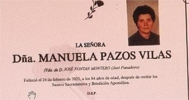 La funeraria SAN MARCOS comunica el fallecimiento hoy día 24 de febrero, de Doña MANUELA PAZOS VILAS cuyos restos mortales permanecerán en el ...
