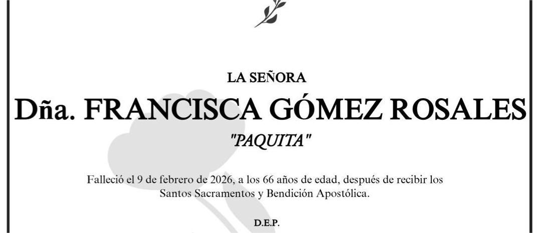 La funeraria SAN MARCOS comunica el fallecimiento, ayer día 9 de enero, de doña FRANCISCA GÓMEZ ROSALES cuyos restos mortales permanecerán en ...