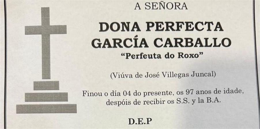 La funeraria LA FE comunica el fallecimiento hoy, día 4 de enero, de doña PERFECTA GARCÍA CARBALLO cuyos restos mortales permanecerán en el ...