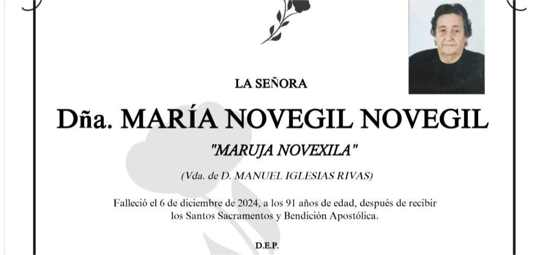La funeraria SAN MARCOS comunica el fallecimiento, hoy día 6 de Doña MARÍA NOVEGIL NOVEGIL cuyos restos mortales permanecen en la sala ...