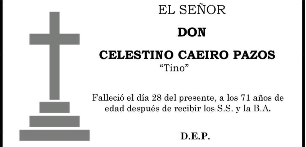 La funeraria LA FE comunica que, en la sala número 2 del tanatorio San Marcos en Marín, se velan los restos mortales de Don Celestino Caeiro ...