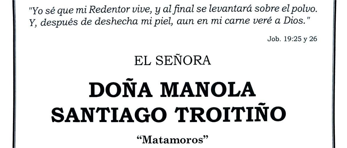 La funeraria LA FE comunica el fallecimiento HOY, día 21 de enero, de doña MANOLA SANTIAGO TROTIÑO cuyos restos mortales permanecerán en el ...