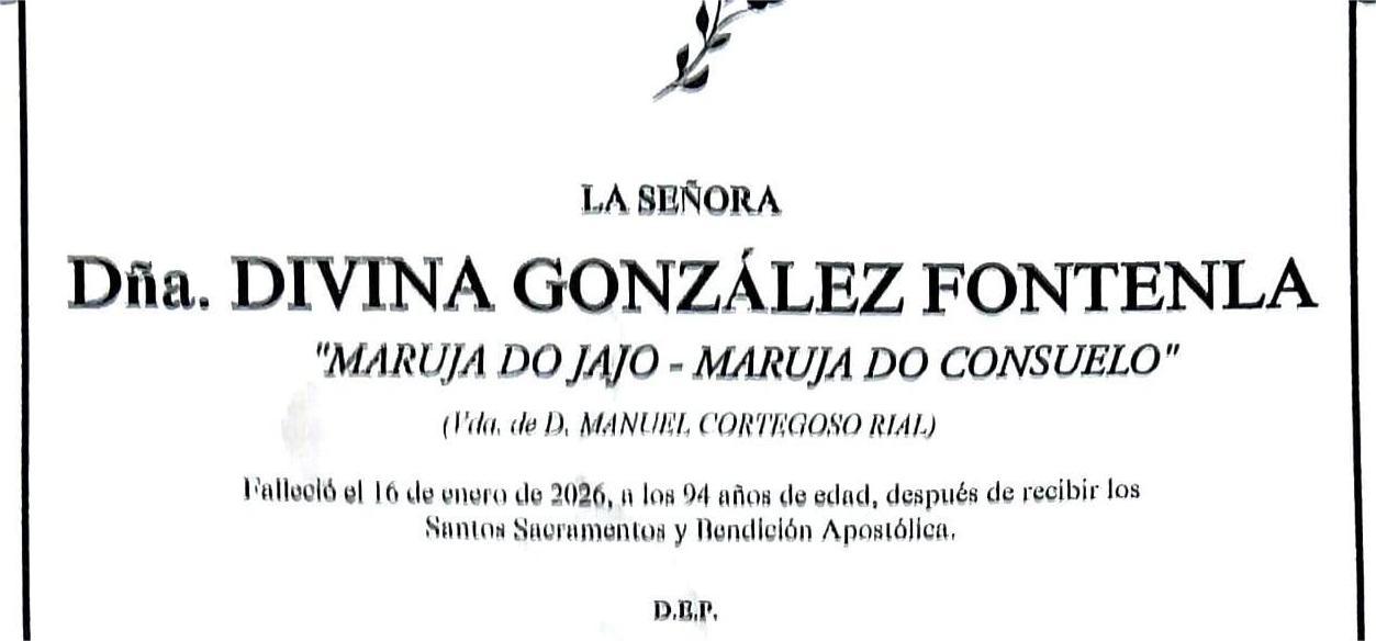 La funeraria SAN MARCOS comunica el fallecimiento HOY, día 16 de enero, de doña DIVINA GONZÁLEZ FONTENLA cuyos restos mortales permanecerán en ...
