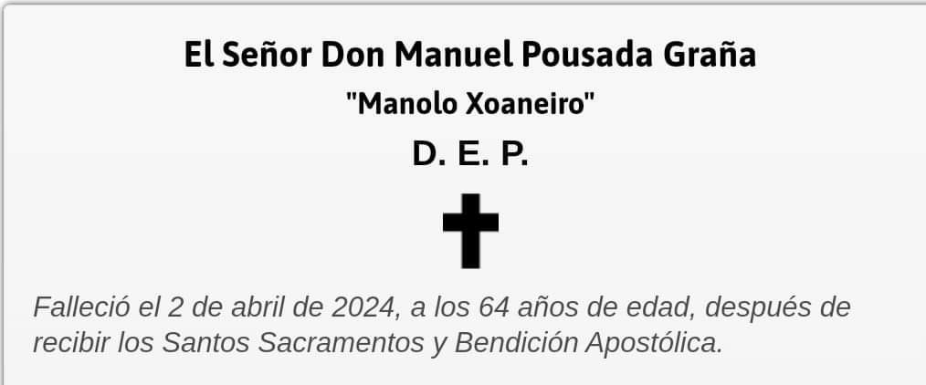 La Funeraria San Marcos informa que, en la sala de velaciones número 1 de su tanatorio de Poio se encuentran los restos mortales de D. Manuel ...