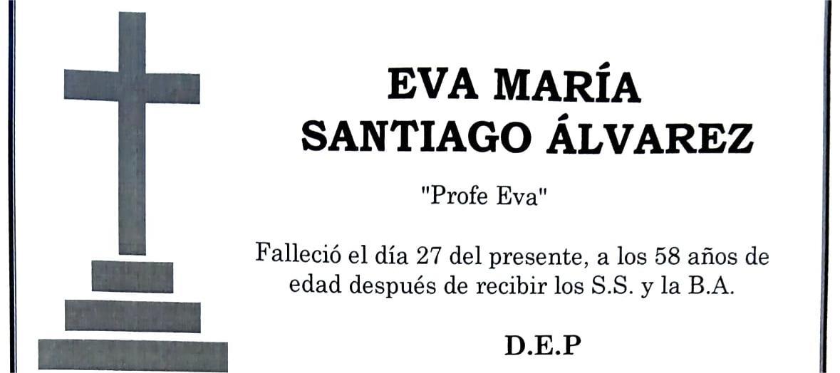 La funeraria LA FE comunica el fallecimiento hoy día 27 de diciembre, de Doña EVA MARÍA SANTIAGO ÁLVAREZ cuyos restos mortales permanecerán ...