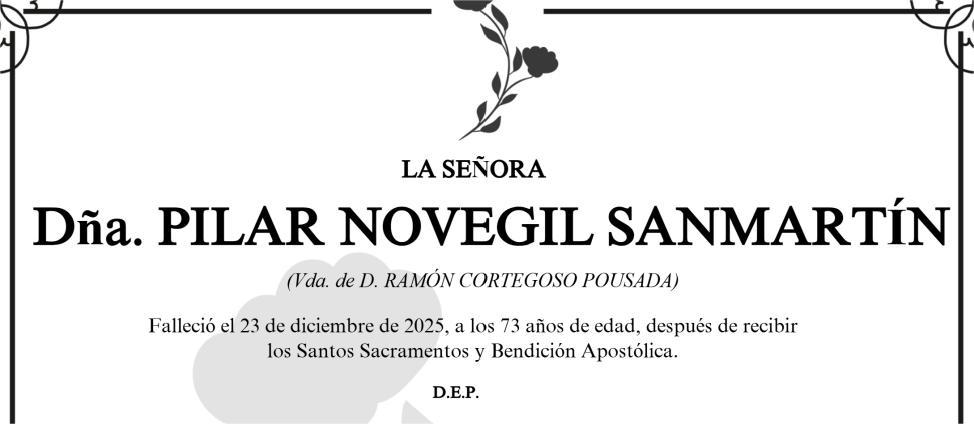 La funeraria SAN MARCOS comunica el fallecimiento hoy día 23 de diciembre de Doña PILAR NOVEGIL SANMARTÍN cuyos restos mortales permanecerán ...