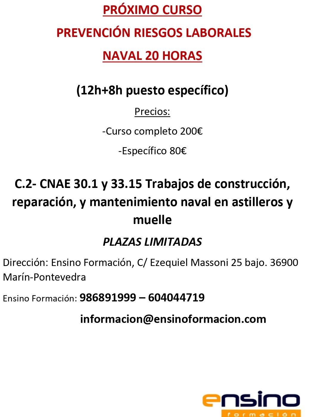 La Academia Ensino comunica que se encuentra abierto el plazo de inscripción para el Curso de Prevención de Riesgos Laborales del Naval de 20 hors de duración que ...