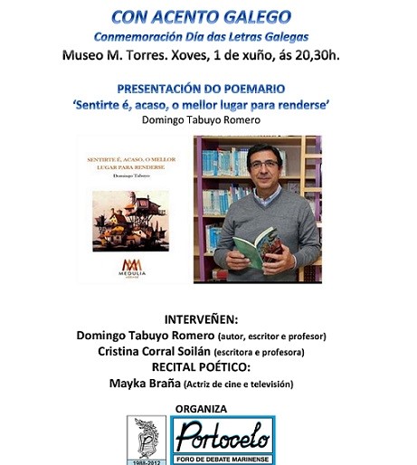 El Club de Opinión Portocelo organiza una charla 'Con acento galego', conmemorativa del 'Dia das Letras Galegas', alrededor del poemario 'Sentirte é, acaso, o ...