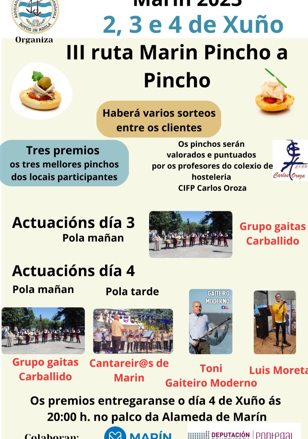 La asociación Botón de Ancla ya tiene cerrado el cartel de la "lll ruta Marín Pincho a Pincho" y el cartel de las actuaciones que se celebrará los días 2 3 4 ...