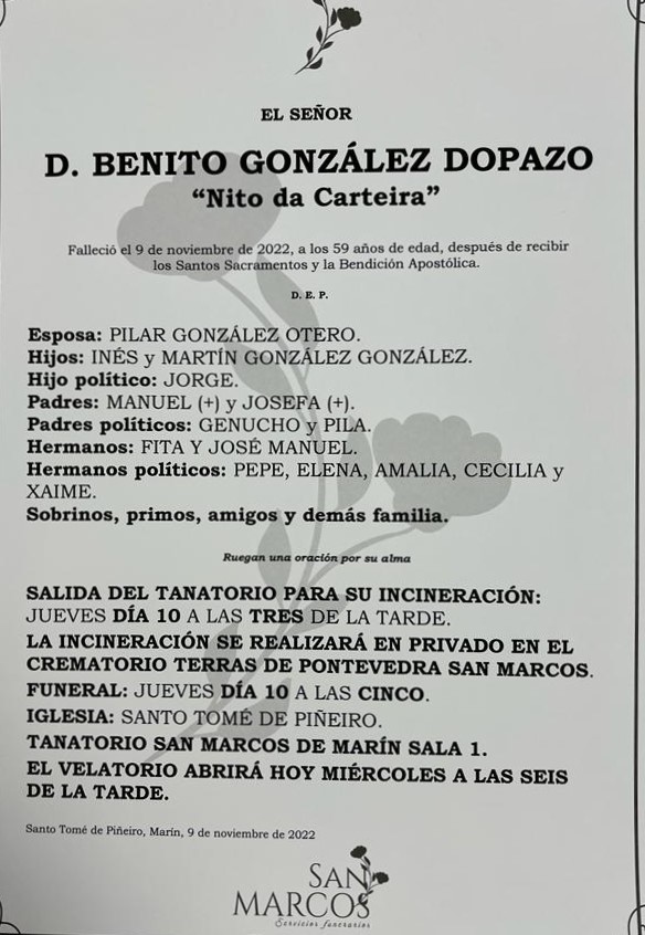 Desde las seis de la trde de hoy estará abierto el velatorio del cadáver de Benito González Dopazo, concejal de Marín fallecido en el accidente de Pontesa el pasado ...