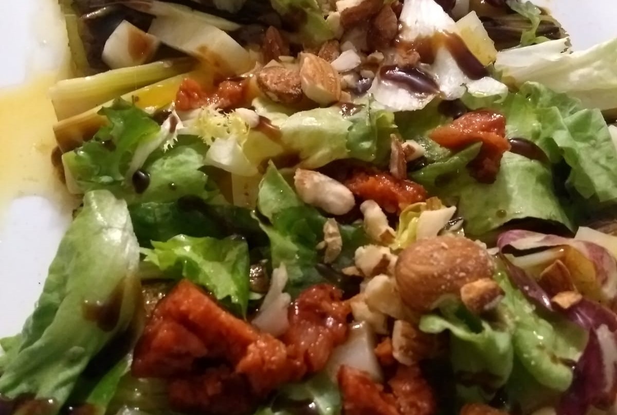 Hoy ensalada templada de puerro a la brasa con almendras y cecina